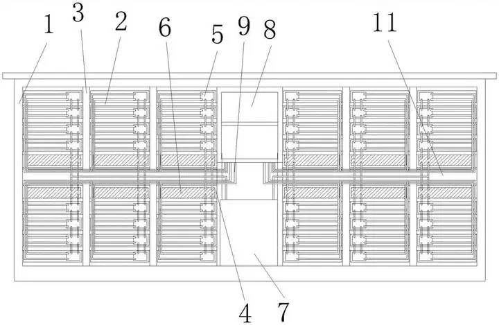本实用新型提供了一种基于1500V液冷方案的高密度前维护20尺LFP储能能源柜,包括能源柜柜体,所述能源柜柜体内左右两端从上至下等距离设置有多个第一隔板,所述能源柜柜体内从左至右等距离设置有多个第二隔板,所述第一隔板和所述第二隔板相配合形成放置区,所述放置区内设置有电池模组和簇主控箱,所述电池模组和所述簇主控箱经线缆连接,所述能源柜柜体内中部下端设置有柜主控箱,所述能源柜柜体内中部上端设置有水冷机组,所述水冷机组与所述电池模组经管道连接,所述柜主控箱经线缆与所述簇主控箱连接设置;本实用新型结构简单,操作便捷,能够改善电池运行环境。