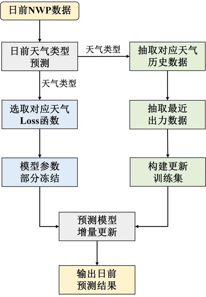 短期光伏功率预测对电网调度以及安全运行至关重要。针对传统短期预测模型在特殊天气下准确率低以及未考虑光伏运行环境后续变化的问题,提出了一种基于多模式增量更新的短期光伏功率预测方法。在分析气象特征的基础上,根据历史情况预测广义天气类型,在日前根据预测天气类型制定相应的训练函数与数据增强方法,最后基于参数冻结技术对模型进行增量更新,提升了模型对特殊天气的刻画能力以及对后续环境的适应能力。在真实的光伏数据集上进行实验,结果证明该更新方法能够有效提高预测准确性。